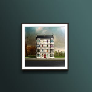 Striking, slightly surreal, and very contemporary depiction of a traditional Glasgow tenement building. Includes details such as a vintage glasgow bus, the Waverley,