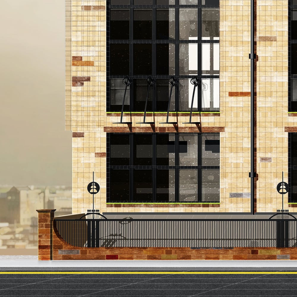The Glasgow School of Art 2022 - Closed Version ". A contemporary 3d digital fine art piece of the world famous Mackintosh building. This version is the surreal and empty closed door version of the School as it hasn't been open since the tragic fire a couple of years ago. Lights off, no one there, nothing happening, no art made.